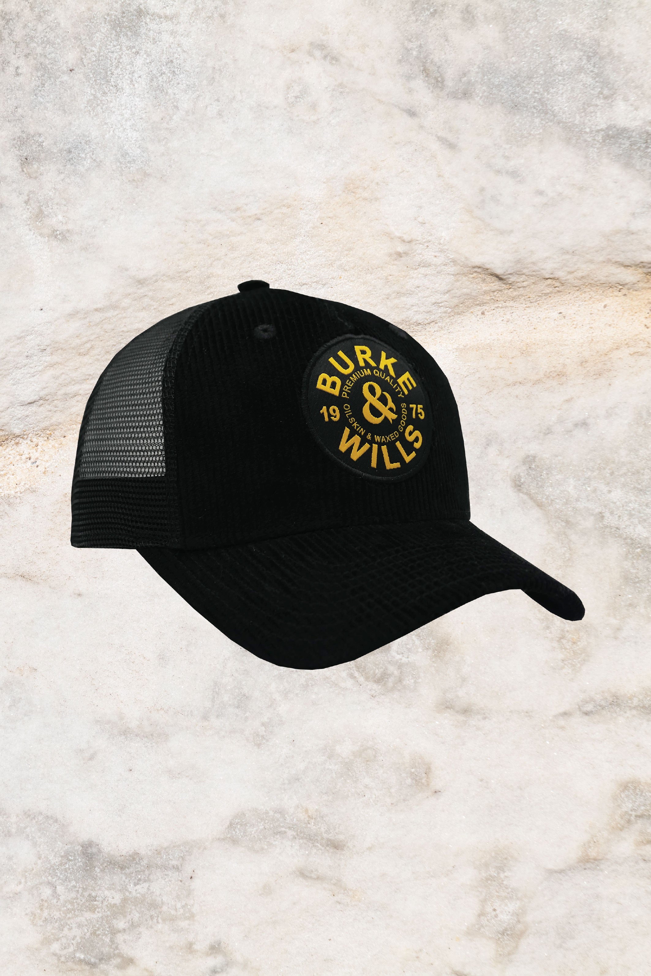 The Burke & Wills Charlie Trucker Cap features a quality 5-panel trucker design with a structured crown and curved brim. It is made from 100% cotton cord with a mesh back. The adjustable plastic snap-back closure ensures a customizable fit for all head sizes, and the classic woven logo label on the front adds to the overall appeal of the cap.