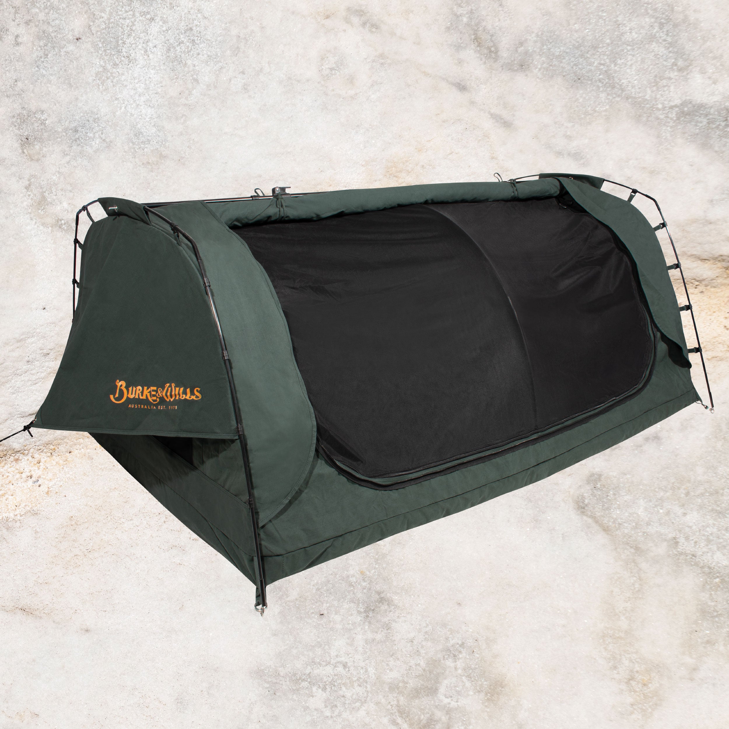 Burke & Wills swags feature our very own and original Australian designed STORMGUARD canvas. This heavy duty and durable 15oz cotton/polyester canvas has been constructed using a tight and tough grid shaped ripstop weave. Our advanced and technically treated canvas is waterproof as well as mould and decay resistant. It provides for superior breathability and airflow keeping you protected and comfortable in all weather conditions.