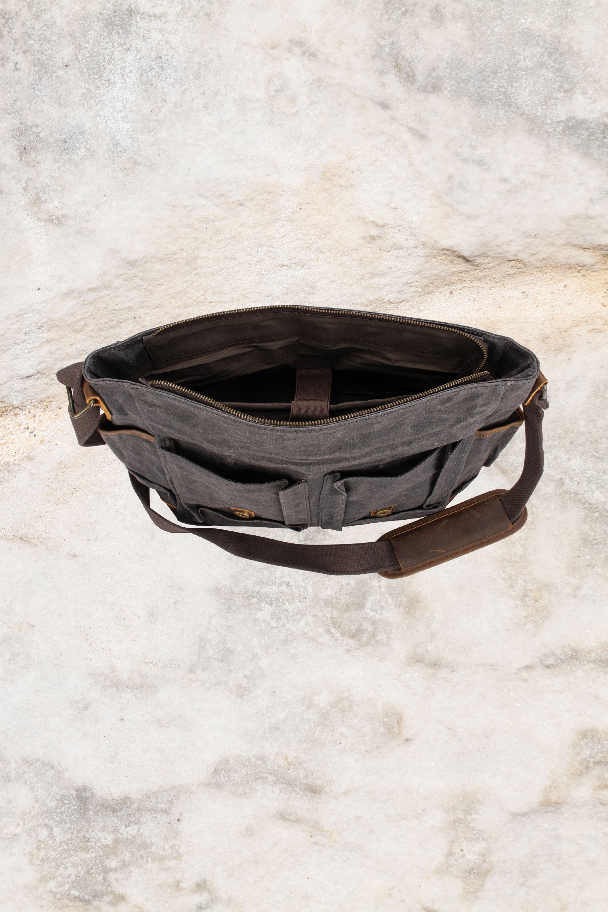 - Zip opening at bag top under flap