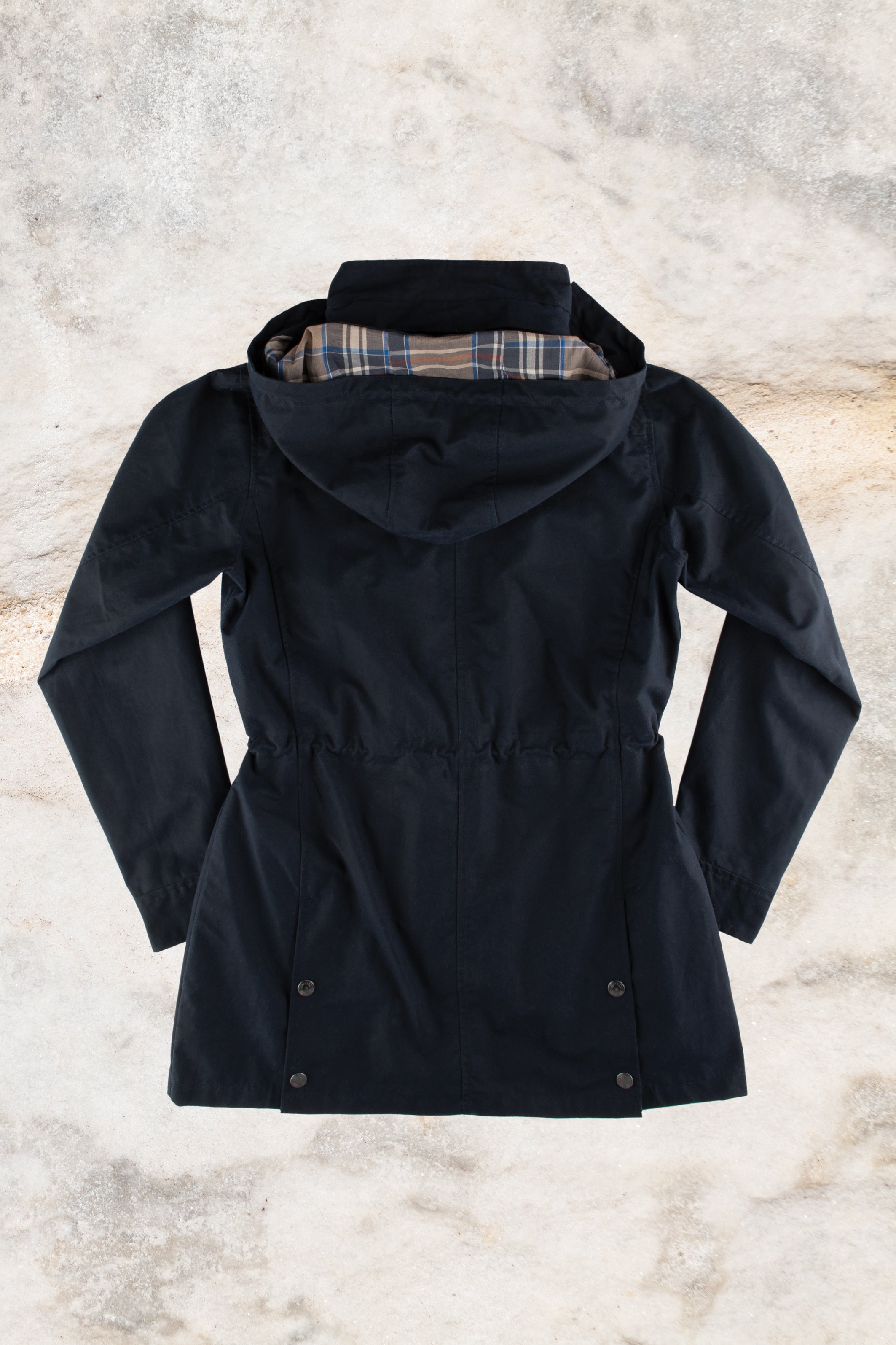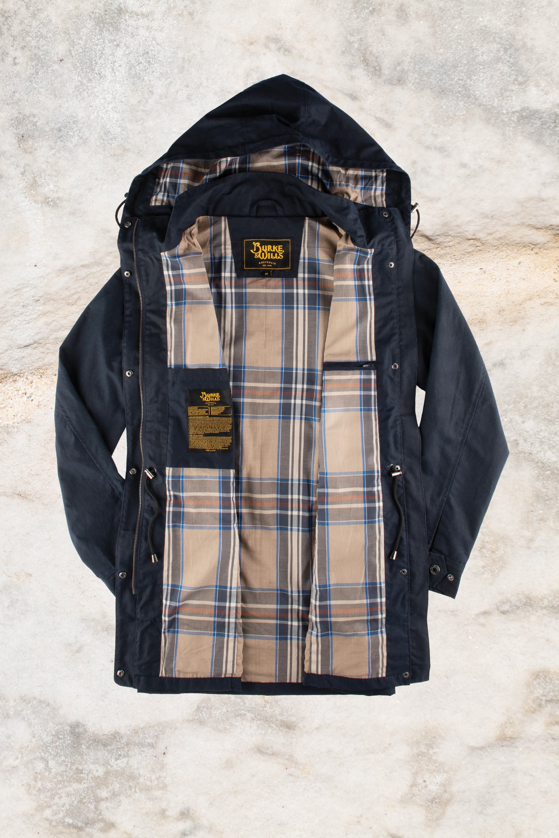 - Cotton check lined detachable hood with drawcord